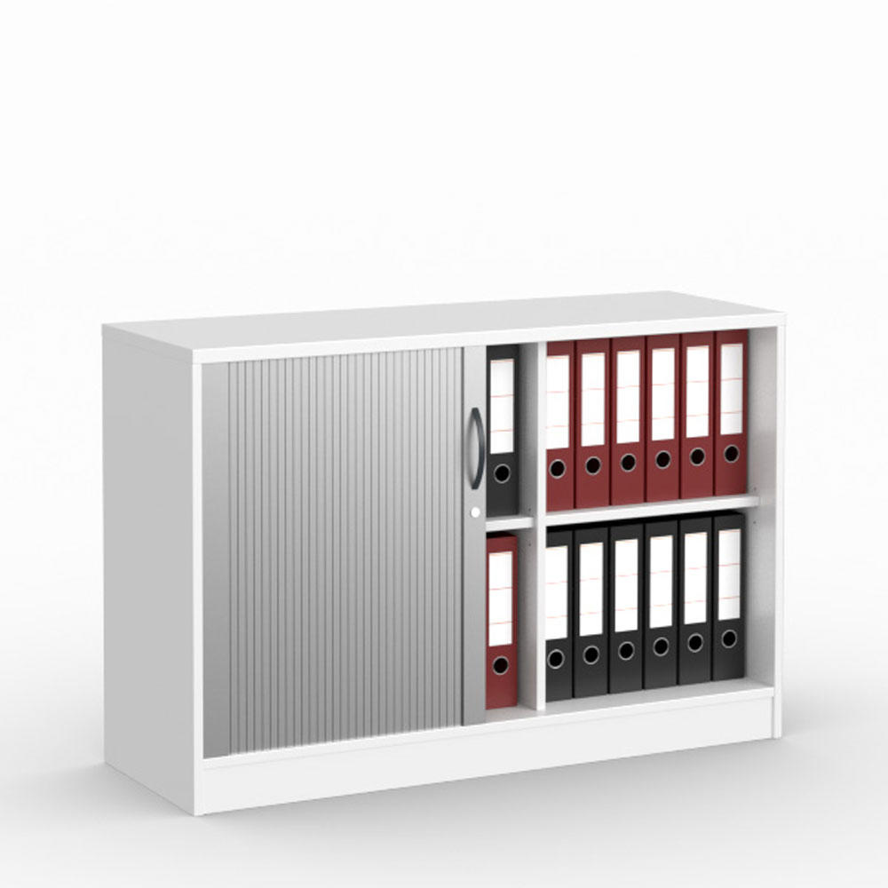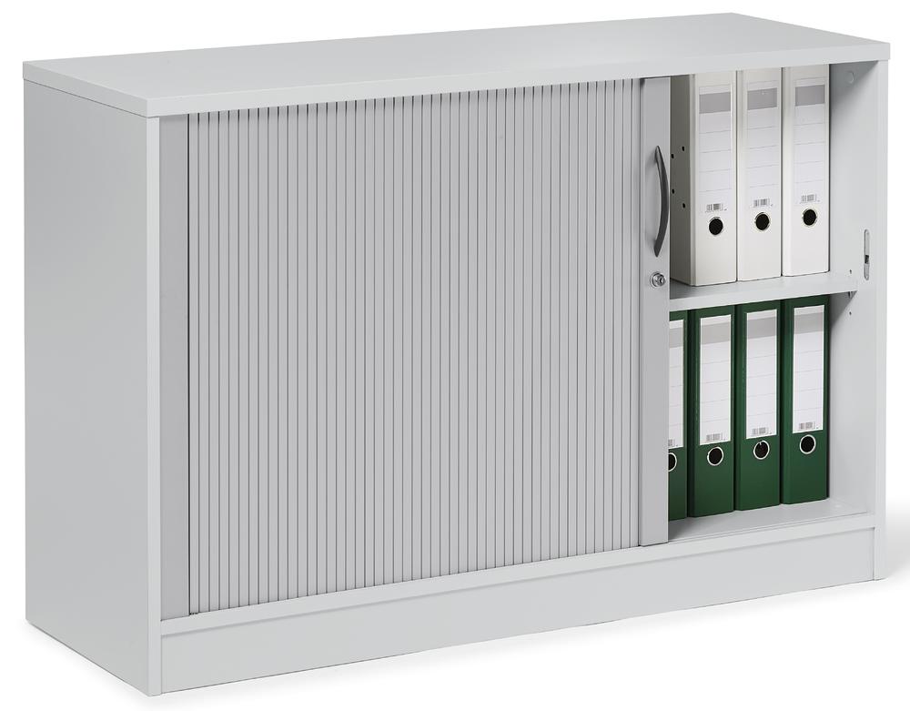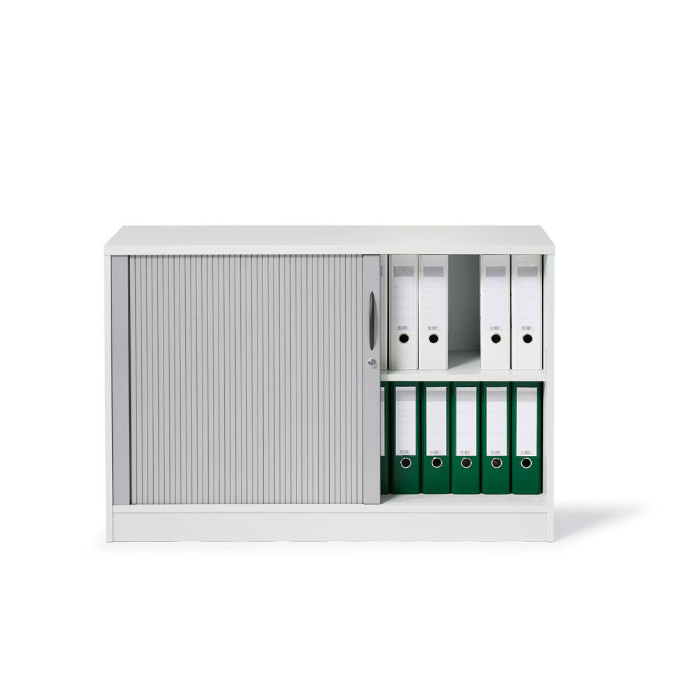 Die Rollladenschränke stellen bei gleichen Vorteilen wie die Schiebetürenschränke eine optische Alternative dar. Beim Öffnen verschwindet die hochwertige Rollladenmatte platzsparend im Inneren des Schrankes. So haben Sie direkten Zugriff auf alle Unterlagen. Eine Funktionsfläche, wie etwa bei Flügeltürenschränken üblich, entfällt. Ihre Büroflächen werden effizienter genutzt. Und: Durch die elegante Lackierung in Alusilber verleihen Sie Ihrem Büro ein hochwertiges Ambiente.